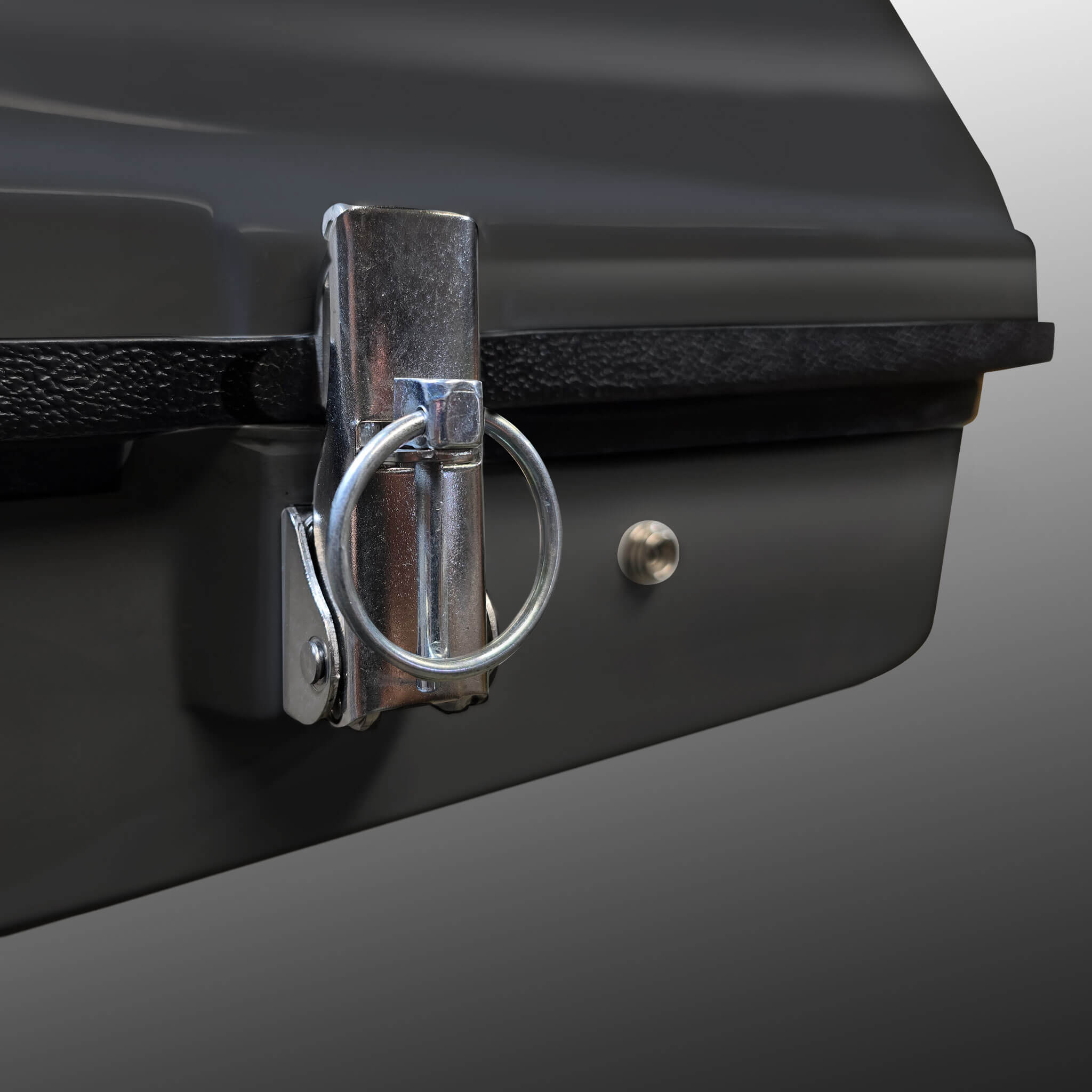 The unit has heavy-duty locking latches to secure the lid and reduce vibration. It uses strong nylon hinges reinforced with a metal plate inside the fiberglass shell for durability, and gas lifter shocks with pull cord make lid operation smooth and easy.